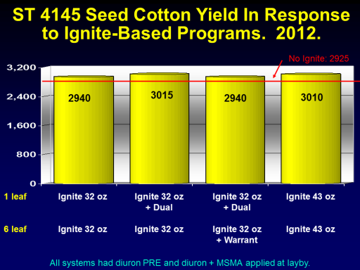 2940<BR>2940<BR>3015<BR>3010<BR>All systems had diuron PRE and diuron + MSMA applied at layby.<BR>ST 4145 Seed Cotton Yield In Response to Ignite-Based Programs.  2012.<BR>No Ignite: 2925<BR>