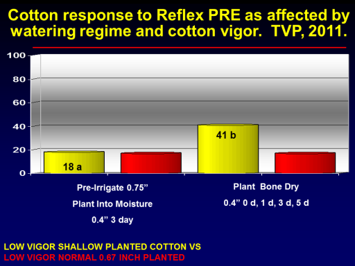 41 b<BR>18 a<BR>Cotton response to Reflex PRE as affected by watering regime and cotton vigor.  TVP, 2011.<BR>Plant  Bone Dry <BR>0.4” 0 d, 1 d, 3 d, 5 d<BR> <BR>Pre-Irrigate 0.75” <BR>Plant Into Moisture <BR>0.4” 3 day<BR>LOW VIGOR SHALLOW PLANTED COTTON VS   <BR>LOW VIGOR NORMAL 0.67 INCH PLANTED<BR>