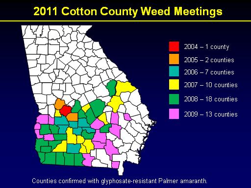 2011 Cotton County Weed Meetings<BR>2004 – 1 county<BR>2005 – 2 counties<BR>2006 – 7 counties<BR>2007 – 10 counties<BR>2008 – 18 counties<BR>2009 – 13 counties<BR>Counties confirmed with glyphosate-resistant Palmer amaranth.<BR>