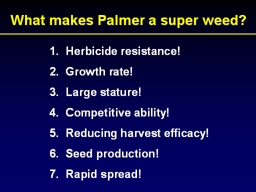 What makes Palmer a super weed? <BR> Herbicide resistance! <BR> Growth rate! <BR> Large stature! <BR> Competitive ability! <BR> Reducing harvest efficacy! <BR> Seed production! <BR> Rapid spread!<BR>