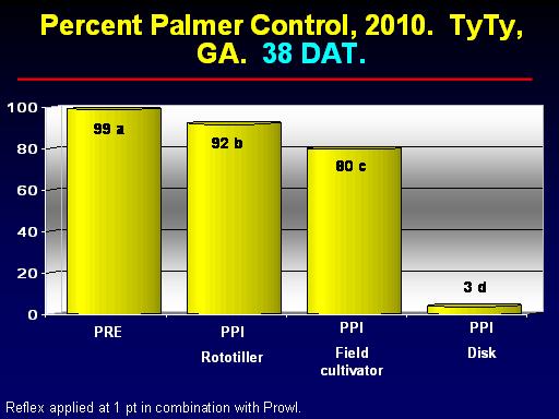 80 c<BR>99 a<BR>92 b<BR>PRE<BR>3 d<BR>Reflex applied at 1 pt in combination with Prowl.<BR>PPI <BR>Rototiller<BR>PPI <BR>Field cultivator<BR>PPI <BR>Disk<BR>Percent Palmer Control, 2010.  TyTy, GA.  38 DAT. <BR>