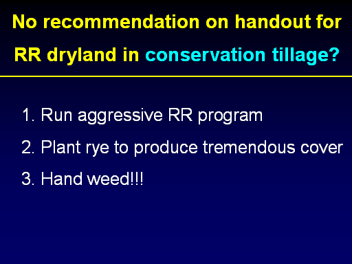 No recommendation on handout for RR dryland in conservation tillage? <BR> Run aggressive RR program <BR> Plant rye to produce tremendous cover <BR> Hand weed!!! <BR>