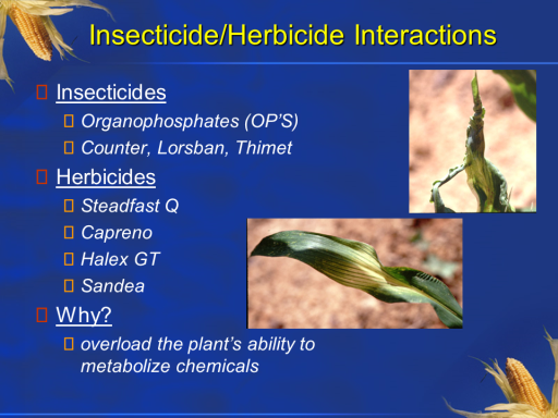 Insecticide/Herbicide Interactions<BR>Insecticides <BR>Organophosphates (OP’S) <BR>Counter, Lorsban, Thimet <BR>Herbicides <BR>Steadfast Q <BR>Capreno <BR>Halex GT <BR>Sandea <BR>Why? <BR>overload the plant’s ability to metabolize chemicals<BR>