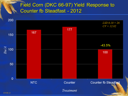 Field Corn (DKC 66-97) Yield Response to Counter fb Steadfast - 2012<BR>CN-06-12<BR>Bu/A<BR>Treatment<BR>LSD 0.10 = 26 <BR>CV = 12.82<BR>-43.5%<BR>