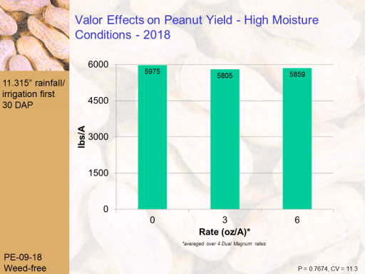 Valor Effects on Peanut Yield - High Moisture Conditions - 2018 <BR>PE-09-18 <BR>Weed-free<BR>P = 0.7674, CV = 11.3<BR>*averaged over 4 Dual Magnum rates<BR>11.315” rainfall/ <BR>irrigation first  <BR>30 DAP<BR>