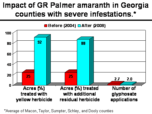 Impact of GR Palmer amaranth in Georgia  counties with severe infestations.*<BR>92<BR>25<BR>25<BR>2.0<BR>2.7<BR>88<BR>Acres (%) treated with yellow herbicide<BR>Acres (%) treated with additional residual herbicide<BR>Number of glyphosate applications<BR>*Average of Macon, Taylor, Sumpter, Schley, and Dooly counties<BR>