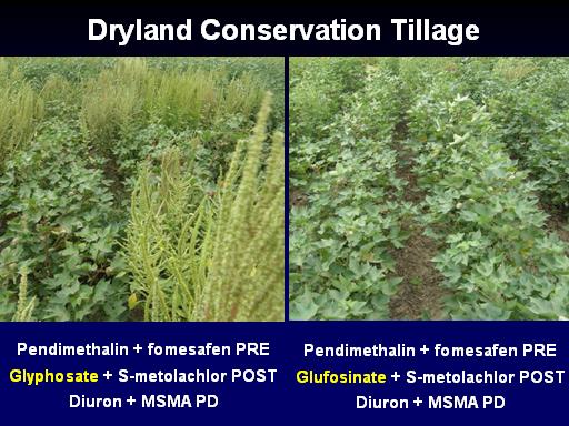 Dryland Conservation Tillage<BR>Pendimethalin + fomesafen PRE <BR>Glyphosate + S-metolachlor POST <BR>Diuron + MSMA PD<BR>Pendimethalin + fomesafen PRE <BR>Glufosinate + S-metolachlor POST <BR>Diuron + MSMA PD<BR>