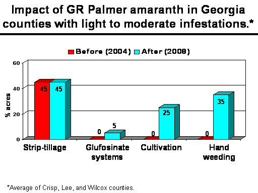 45<BR>5<BR>% acres<BR>45<BR>25<BR>0<BR>0<BR>35<BR>Strip-tillage<BR>Glufosinatesystems<BR>Cultivation<BR>Hand weeding<BR>0<BR>Impact of GR Palmer amaranth in Georgia counties with light to moderate infestations.*<BR>*Average of Crisp, Lee, and Wilcox counties.<BR>
