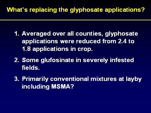 What’s replacing the glyphosate applications? <BR>Averaged over all counties, glyphosate applications were reduced from 2.4 to 1.8 applications in crop. <BR>Some glufosinate in severely infested fields. <BR>Primarily conventional mixtures at layby including MSMA? <BR>