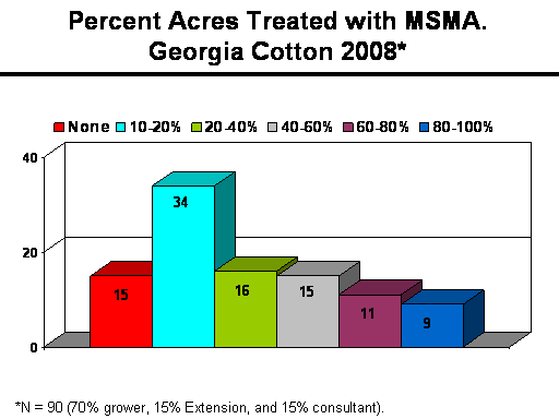 Percent Acres Treated with MSMA.     Georgia Cotton 2008*<BR>15<BR>15<BR>*N = 90 (70% grower, 15% Extension, and 15% consultant).<BR>34<BR>9<BR>16<BR>11<BR>