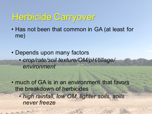 Herbicide Carryover<BR>Has not been that common in GA (at least for me) <BR> <BR>Depends upon many factors <BR>crop/rate/soil texture/OM/pH/tillage/ environment <BR> <BR>much of GA is in an environment that favors the breakdown of herbicides <BR>high rainfall, low OM, lighter soils, soils never freeze<BR>
