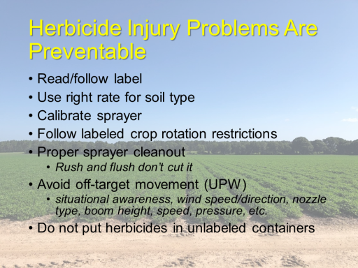 Herbicide Injury Problems Are Preventable<BR>Read/follow label <BR>Use right rate for soil type <BR>Calibrate sprayer <BR>Follow labeled crop rotation restrictions <BR>Proper sprayer cleanout <BR>Rush and flush don’t cut it <BR>Avoid off-target movement (UPW) <BR>situational awareness, wind speed/direction, nozzle type, boom height, speed, pressure, etc. <BR>Do not put herbicides in unlabeled containers<BR>