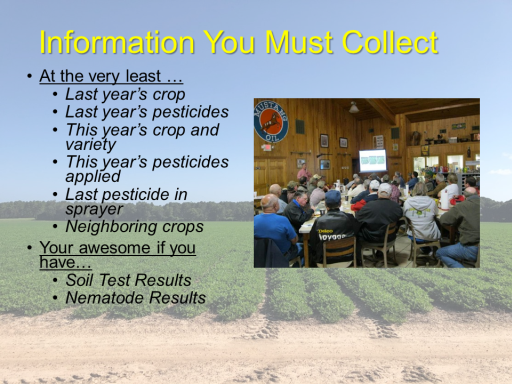 Information You Must Collect<BR>At the very least … <BR>Last year’s crop <BR>Last year’s pesticides <BR>This year’s crop and variety <BR>This year’s pesticides applied <BR>Last pesticide in sprayer <BR>Neighboring crops <BR>Your awesome if you have… <BR>Soil Test Results <BR>Nematode Results <BR>