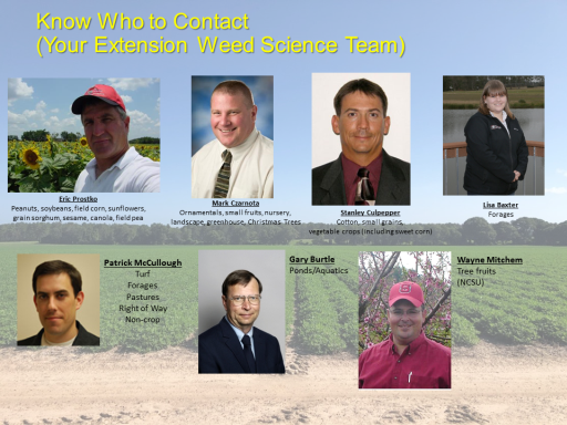 Know Who to Contact (Your Extension Weed Science Team)<BR>Eric Prostko <BR>Peanuts, soybeans, field corn, sunflowers, grain sorghum, sesame, canola, field pea<BR>Mark Czarnota <BR>Ornamentals, small fruits, nursery,  <BR>landscape, greenhouse, Christmas  Trees<BR>Stanley Culpepper <BR>Cotton, small grains,  <BR>vegetable crops (including sweet corn)<BR>Patrick McCullough <BR>Turf <BR>Forages <BR>Pastures <BR>Right of Way <BR>Non-crop <BR>Gary Burtle <BR>Ponds/Aquatics<BR>Wayne Mitchem <BR>Tree fruits <BR>(NCSU)<BR>Lisa Baxter <BR>Forages<BR>