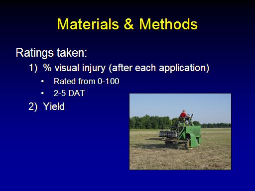 Ratings taken: <BR>% visual injury (after each application) <BR>Rated from 0-100  <BR>2-5 DAT <BR>Yield<BR>Materials & Methods<BR>