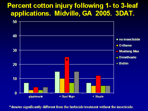 Percent cotton injury following 1- to 3-leaf applications.  Midville, GA  2005.  3DAT.<BR>*<BR>*denotes significantly different from the herbicide treatment without the insecticide.<BR>