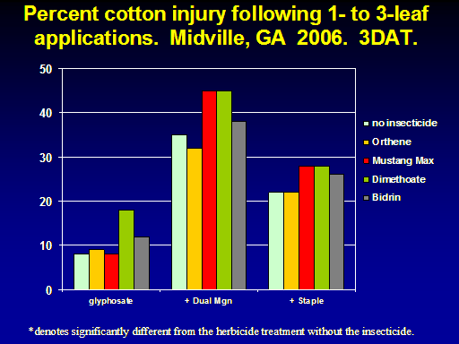 Percent cotton injury following 1- to 3-leaf applications.  Midville, GA  2006.  3DAT.<BR>*denotes significantly different from the herbicide treatment without the insecticide.<BR>