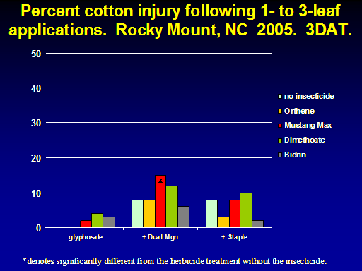 Percent cotton injury following 1- to 3-leaf applications.  Rocky Mount, NC  2005.  3DAT.<BR>*<BR>*denotes significantly different from the herbicide treatment without the insecticide.<BR>