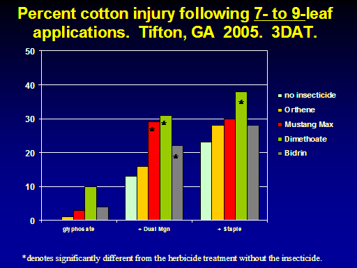 Percent cotton injury following 7- to 9-leaf applications.  Tifton, GA  2005.  3DAT.<BR>*<BR>*<BR>*<BR>*<BR>*denotes significantly different from the herbicide treatment without the insecticide.<BR>