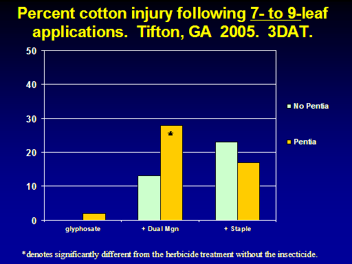 Percent cotton injury following 7- to 9-leaf applications.  Tifton, GA  2005.  3DAT.<BR>*denotes significantly different from the herbicide treatment without the insecticide.<BR>*<BR>