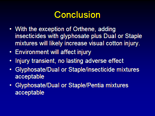 Conclusion<BR>With the exception of Orthene, adding insecticides with glyphosate plus Dual or Staple mixtures will likely increase visual cotton injury. <BR>Environment will affect injury <BR>Injury transient, no lasting adverse effect <BR>Glyphosate/Dual or Staple/insecticide mixtures acceptable <BR>Glyphosate/Dual or Staple/Pentia mixtures acceptable <BR> <BR> <BR>