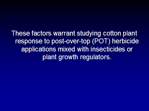 These factors warrant studying cotton plant response to post-over-top (POT) herbicide applications mixed with insecticides or plant growth regulators.<BR>