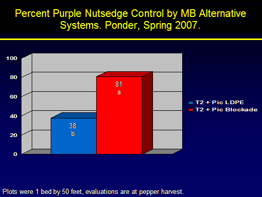 Percent Purple Nutsedge Control by MB Alternative Systems. Ponder, Spring 2007.<BR>Plots were 1 bed by 50 feet, evaluations are at pepper harvest.  <BR>38 b<BR>81 a<BR>