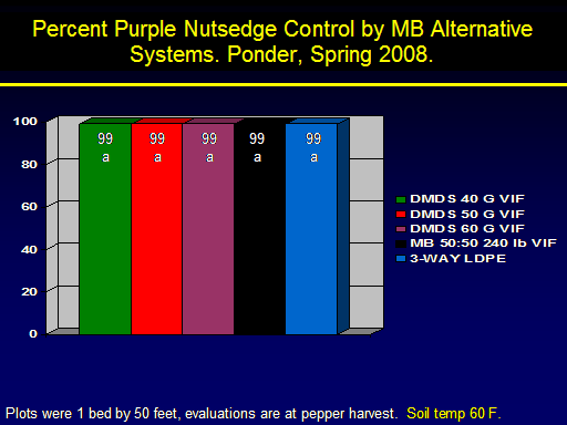 Percent Purple Nutsedge Control by MB Alternative Systems. Ponder, Spring 2008.<BR>99a<BR>Plots were 1 bed by 50 feet, evaluations are at pepper harvest.  Soil temp 60 F.  <BR>99 a<BR>99 a<BR>99 a<BR>99a<BR>