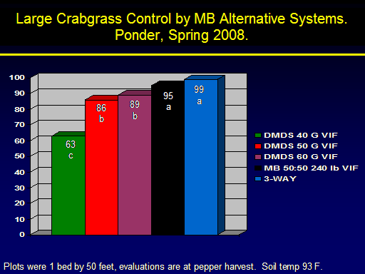 Large Crabgrass Control by MB Alternative Systems. Ponder, Spring 2008.<BR>95 a<BR>89 b<BR>86b<BR>63c<BR>99a<BR>Plots were 1 bed by 50 feet, evaluations are at pepper harvest.  Soil temp 93 F.<BR>