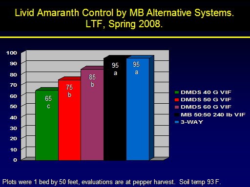 Livid Amaranth Control by MB Alternative Systems.  LTF, Spring 2008.<BR>95 a<BR>85 b<BR>75b<BR>65c<BR>95a<BR>Plots were 1 bed by 50 feet, evaluations are at pepper harvest.  Soil temp 93 F.<BR>