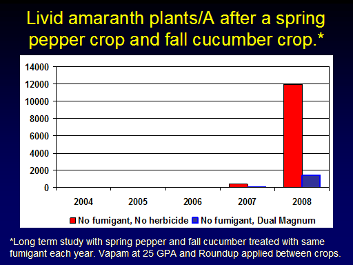 Livid amaranth plants/A after a spring pepper crop and fall cucumber crop.*<BR>*Long term study with spring pepper and fall cucumber treated with same fumigant each year. Vapam at 25 GPA and Roundup applied between crops.<BR>