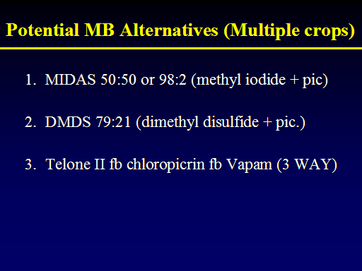 Potential MB Alternatives (Multiple crops)<BR>MIDAS 50:50 or 98:2 (methyl iodide + pic) <BR> <BR>DMDS 79:21 (dimethyl disulfide + pic.) <BR> <BR>Telone II fb chloropicrin fb Vapam (3 WAY)<BR>