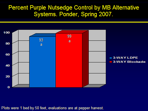 Percent Purple Nutsedge Control by MB Alternative Systems. Ponder, Spring 2007.<BR>Plots were 1 bed by 50 feet, evaluations are at pepper harvest.  <BR>93 a<BR>99a<BR>