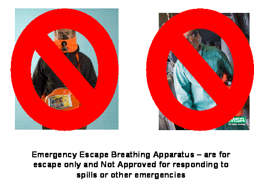 Emergency Escape Breathing Apparatus – are for escape only and Not Approved for responding to spills or other emergencies<BR>