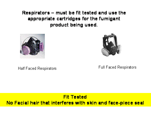 Respirators – must be fit tested and use the appropriate cartridges for the fumigant product being used.<BR>Half Faced Respirators<BR>Full Faced Respirators<BR>Fit Tested <BR>No Facial hair that interferes with skin and face-piece seal <BR>