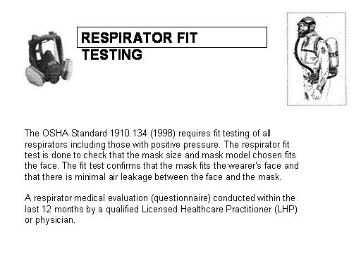 The OSHA Standard 1910.134 (1998) requires fit testing of all respirators including those with positive pressure. The respirator fit test is done to check that the mask size and mask model chosen fits the face. The fit test confirms that the mask fits the wearer's face and that there is minimal air leakage between the face and the mask. <BR> <BR>A respirator medical evaluation (questionnaire) conducted within the last 12 months by a qualified Licensed Healthcare Practitioner (LHP) or physician.<BR>RESPIRATOR FIT TESTING<BR>