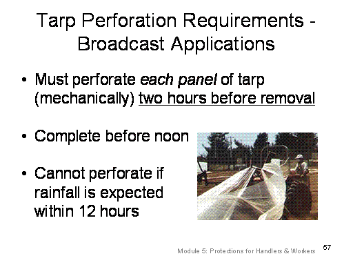 29<BR>Tarp Perforation Requirements - Broadcast Applications<BR>Must perforate each panel of tarp (mechanically) two hours before removal <BR> <BR>Complete before noon <BR> <BR>Cannot perforate if  <BR>	rainfall is expected  <BR>	within 12 hours <BR>Module 5: Protections for Handlers & Workers<BR>