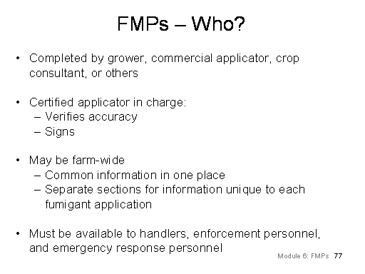 39<BR>FMPs – Who?<BR>Completed by grower, commercial applicator, crop consultant, or others <BR> <BR>Certified applicator in charge: <BR>Verifies accuracy <BR>Signs <BR> <BR>May be farm-wide <BR>Common information in one place <BR>Separate sections for information unique to each fumigant application <BR> <BR>Must be available to handlers, enforcement personnel, and emergency response personnel<BR>Module 6: FMPs<BR>