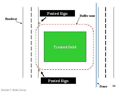 50<BR>50<BR>Treated field <BR>Roadway <BR>Fence<BR>Posted Sign<BR>Posted Sign<BR>Module 7: Buffer Zones<BR>