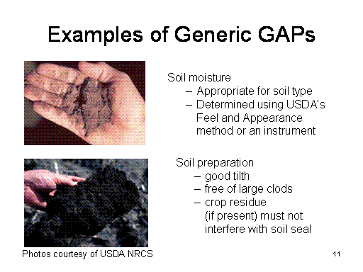 6<BR>Examples of Generic GAPs<BR>Soil moisture <BR>Appropriate for soil type <BR>Determined using USDA’s Feel and Appearance method or an instrument <BR>Soil preparation <BR>good tilth  <BR>free of large clods <BR>crop residue  <BR>	(if present) must not interfere with soil seal <BR>Photos courtesy of USDA NRCS <BR>