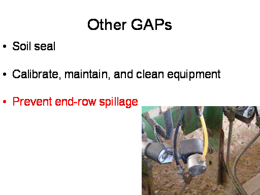 8<BR>Other GAPs<BR> <BR>Soil seal  <BR> <BR>Calibrate, maintain, and clean equipment  <BR> <BR>Prevent end-row spillage <BR> <BR>Module 4: Good Agricultural Practices<BR>