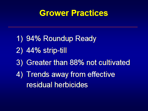 94% Roundup Ready <BR>44% strip-till <BR>Greater than 88% not cultivated <BR>Trends away from effective residual herbicides<BR>Grower Practices<BR>