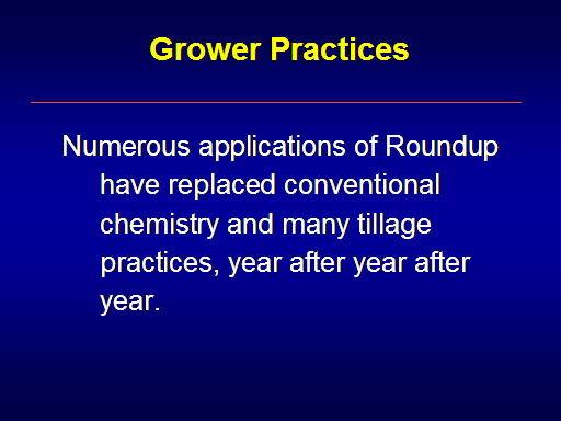 Numerous applications of Roundup have replaced conventional chemistry and many tillage practices, year after year after year.<BR>Grower Practices<BR>