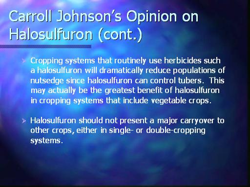 Carroll Johnson’s Opinion on Halosulfuron (cont.)<BR>Cropping systems that routinely use herbicides such a halosulfuron will dramatically reduce populations of nutsedge since halosulfuron can control tubers.  This may actually be the greatest benefit of halosulfuron in cropping systems that include vegetable crops.