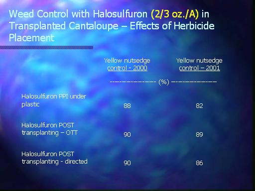 Weed Control with Halosulfuron (2/3 oz./A) in Transplanted Cantaloupe – Effects of Herbicide Placement<BR>