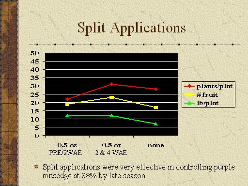 Split Applications<BR>   PRE/2WAE       2 & 4 WAE<BR>Split applications were very effective in controlling purple nutsedge at 88% by late season. <BR>