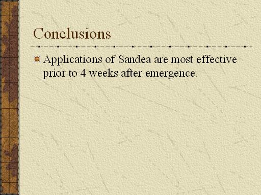 Conclusions<BR>Applications of Sandea are most effective prior to 4 weeks after emergence.<BR>