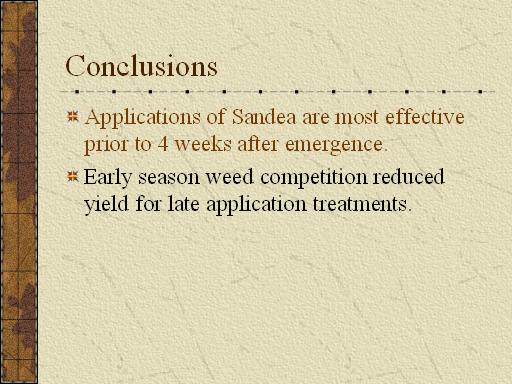 Conclusions<BR>Applications of Sandea are most effective prior to 4 weeks after emergence.