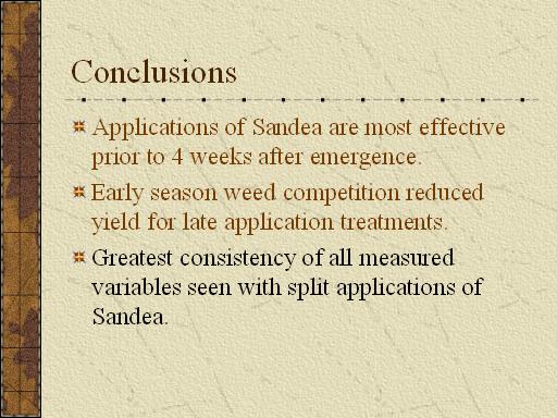 Conclusions<BR>Applications of Sandea are most effective prior to 4 weeks after emergence.