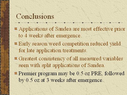 Conclusions<BR>Applications of Sandea are most effective prior to 4 weeks after emergence.